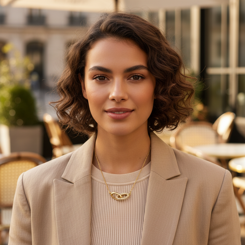 The Embrace Link Necklace features two interlocking links, one polished and one paved with luminous stones. Together, they create a modern symbol of unity and closeness. With its warm gold finish and refined silhouette, this necklace adds a touch of elegance to both everyday outfits and evening looks. A piece that feels personal, expressive, and effortlessly chic.