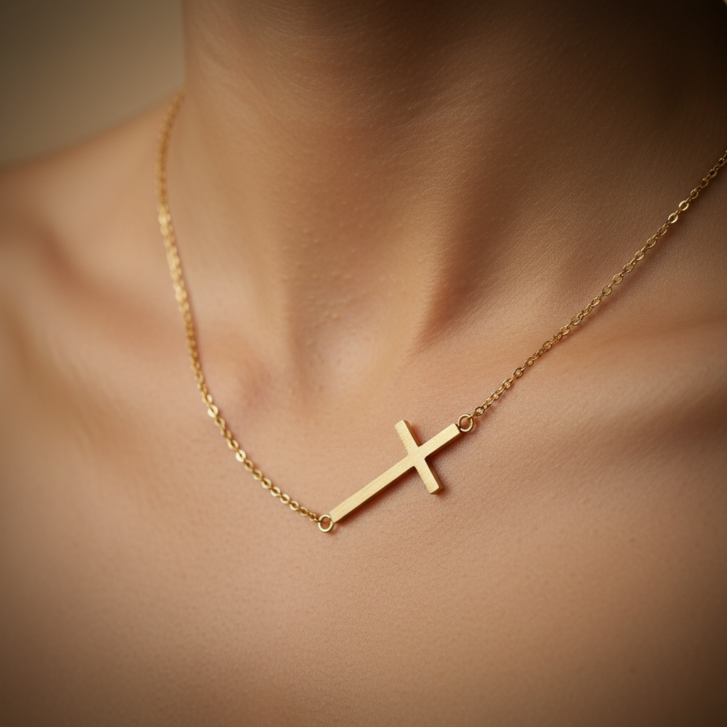 This necklace blends simplicity with intention. The side-hanging cross offers a fresh, effortless take on a timeless symbol, creating a look that’s both understated and striking. Its clean lines and warm gold finish make it the kind of piece you reach for every day—something meaningful, feminine, and refined without trying too hard. A subtle statement for women who appreciate elegance with quiet depth.